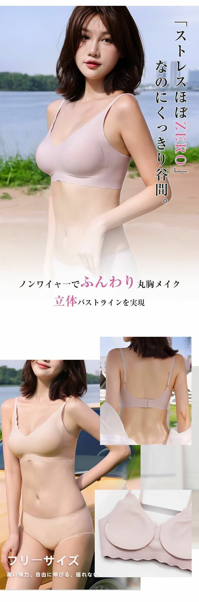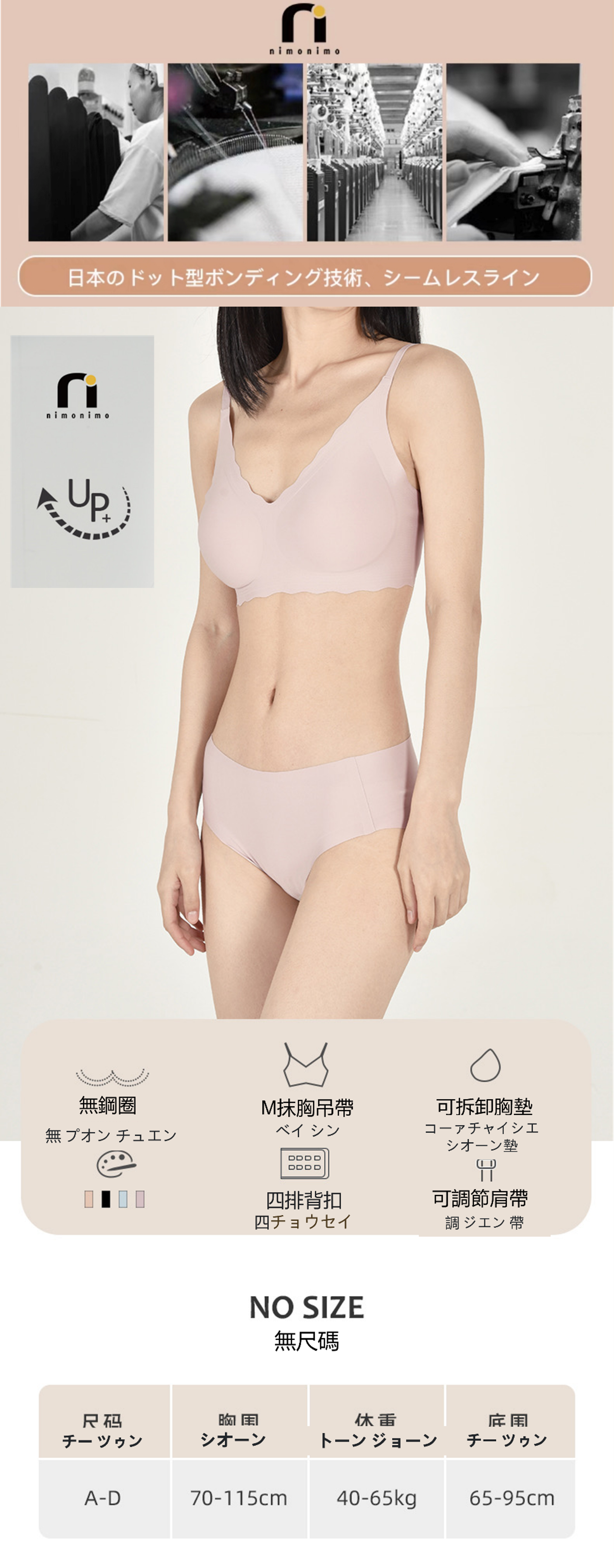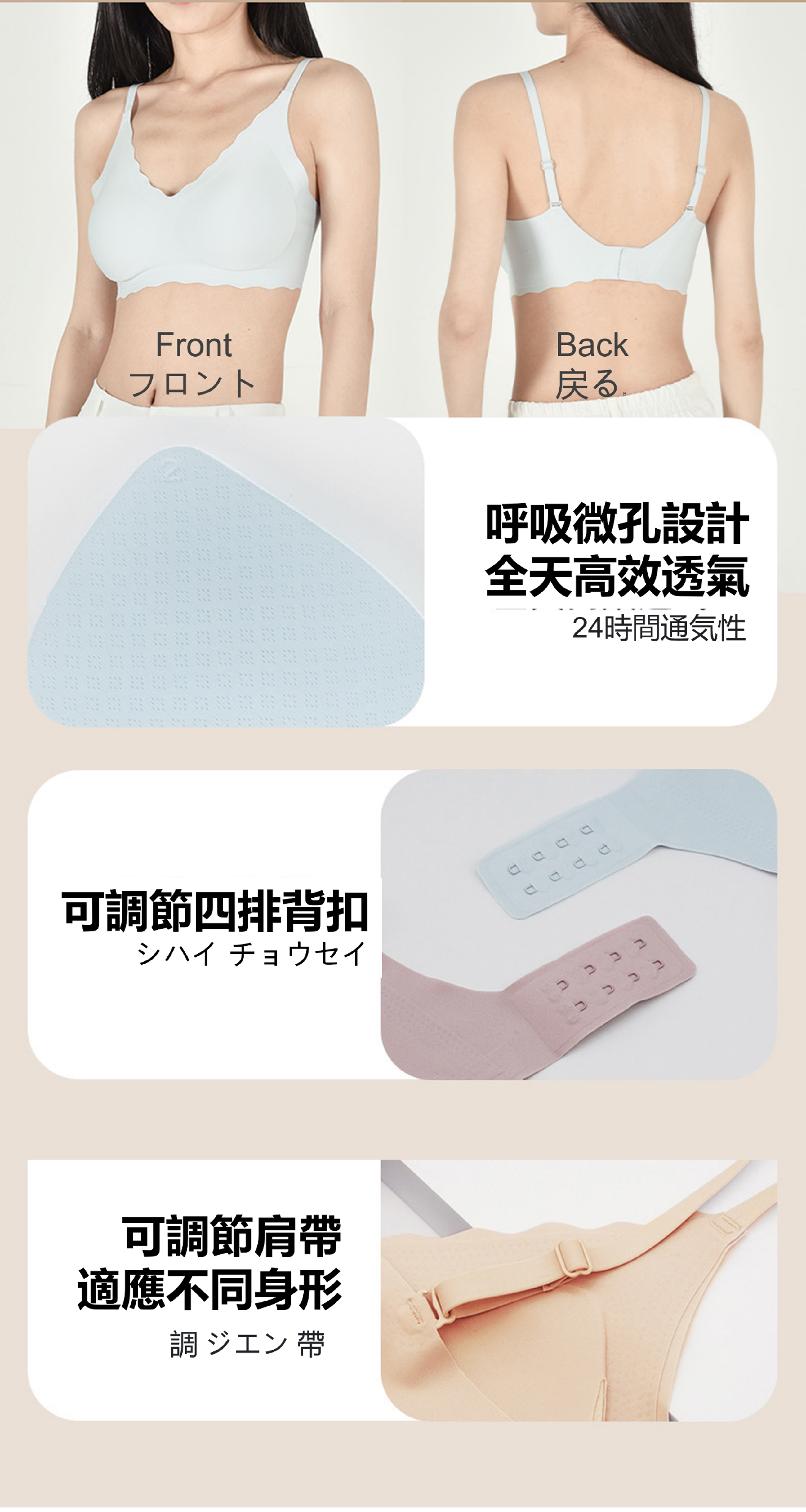日式無針無線全覆蓋美胸設計,以高溫燙壓工藝代替車線,完美解決傳統內衣令肌膚留痕、磨擦不適的負擔,裸感體驗仿如人體second skin,貼身又自在。