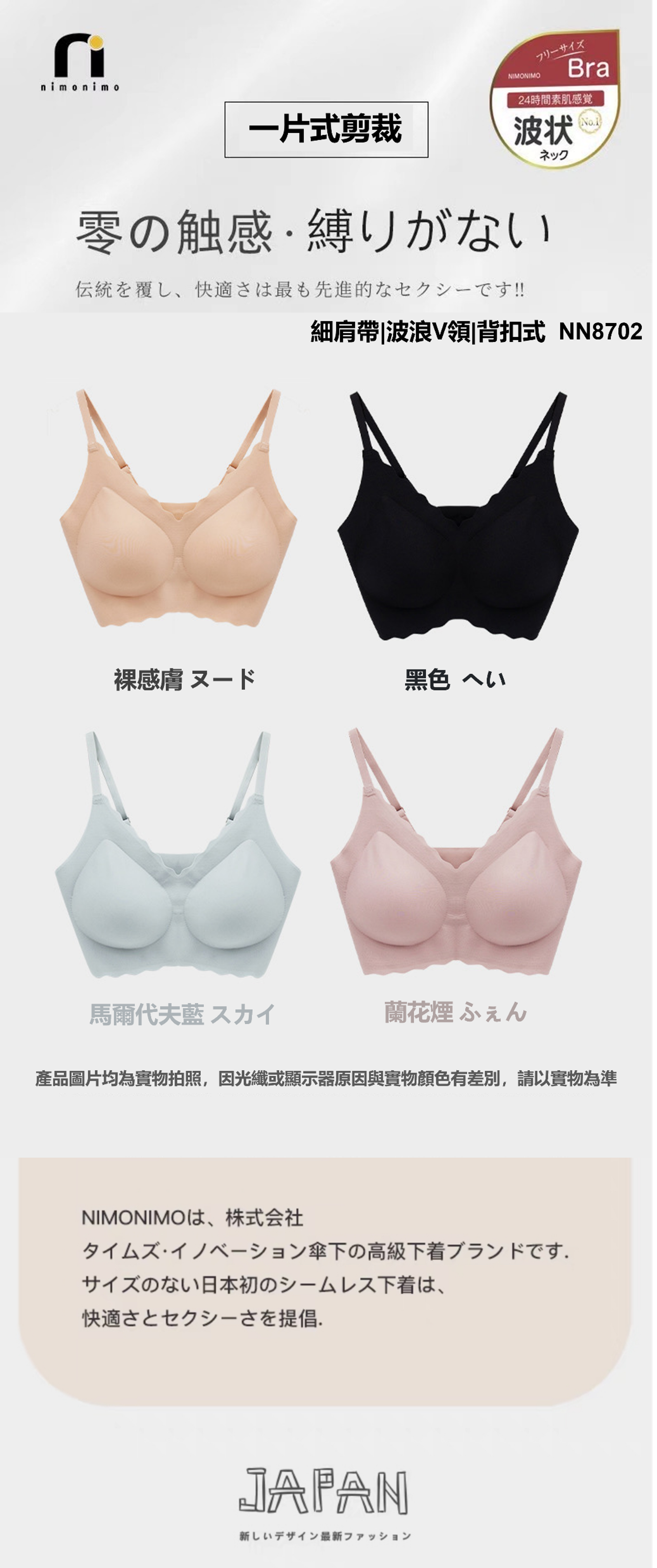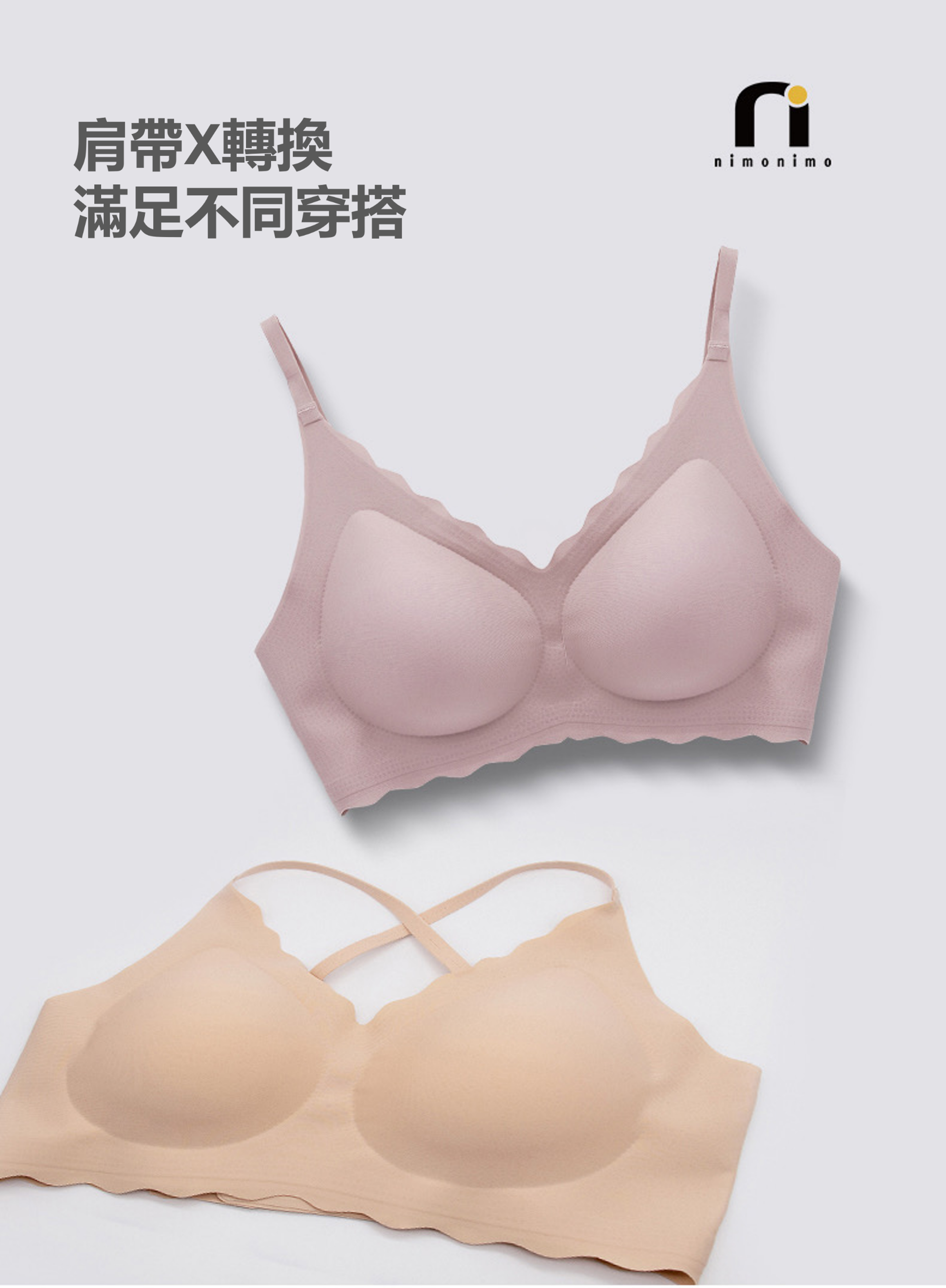 日本NIMO BRA有別於傳統鋼圈內衣對皮膚造成印痕及不適,今次推出零肌感「着完似冇着」但有效承托胸部,不移位,水滴杯型盡顯完美胸型;無痕包邊設計,穿著薄衣不會顯露Bra型;日本親膚科技面料,比市面上嘅Bra輕60%