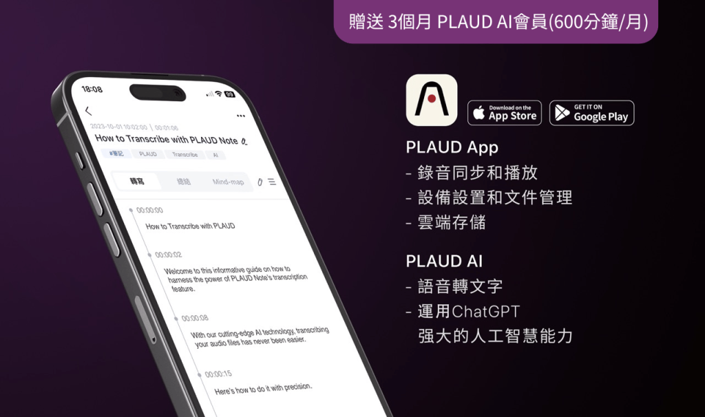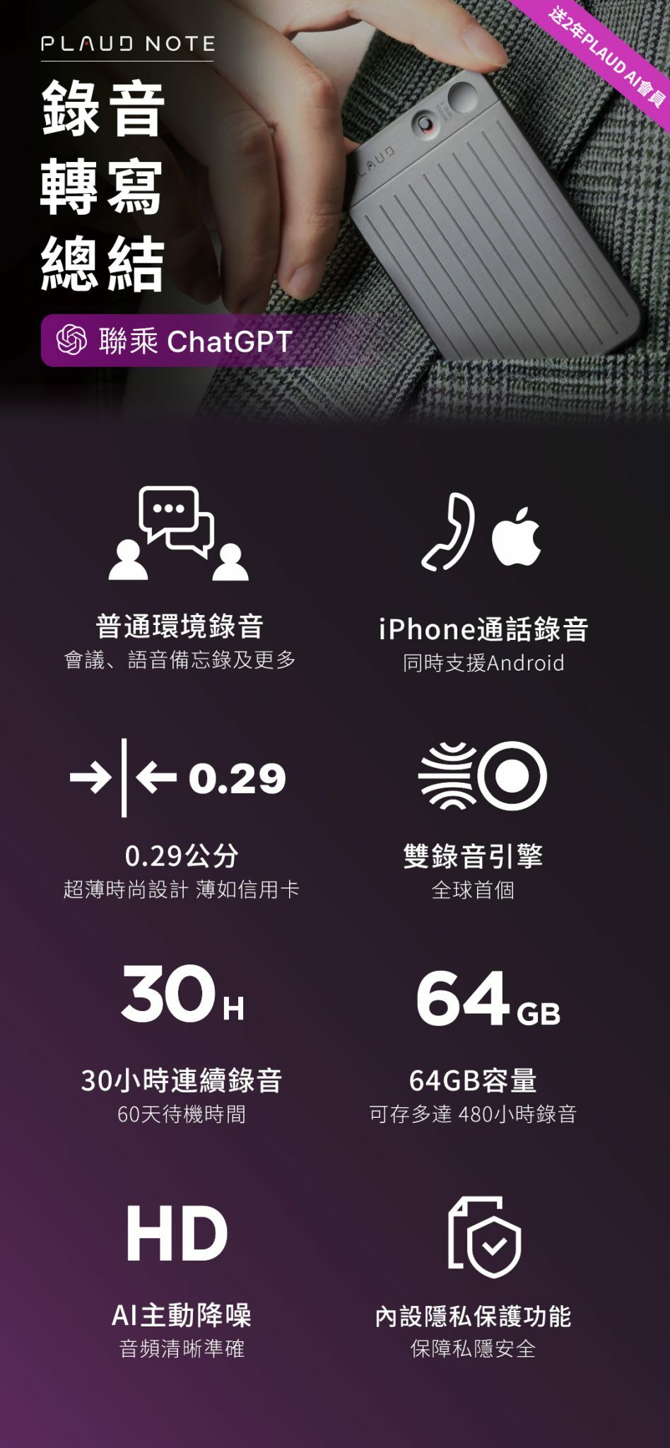 (可升級PLAUD AI PRO會員功能,按年或者轉換分鐘數購買,詳情可參閱PLAUD NOTE app,最新收費以app為準)