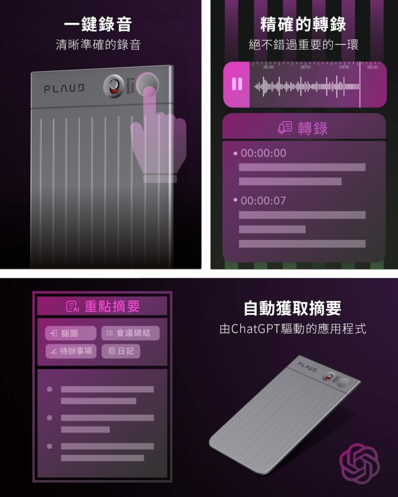 錄音機不再是懷舊產物,PLAUD NOTE 首個ChatGPT 驅動 AI卡片錄音機將ChatGPT人工智能結合錄音機,讓您能隨時隨地得到高品質錄音的同時,PLAUD AI可將您的錄音轉成文字,辨識語言多達112種(廣東話也可以),並且可以無須VPN使用ChatGPT錄音總結服務,輕鬆找出錄音重點,是您能找到最聰明的錄音機!
