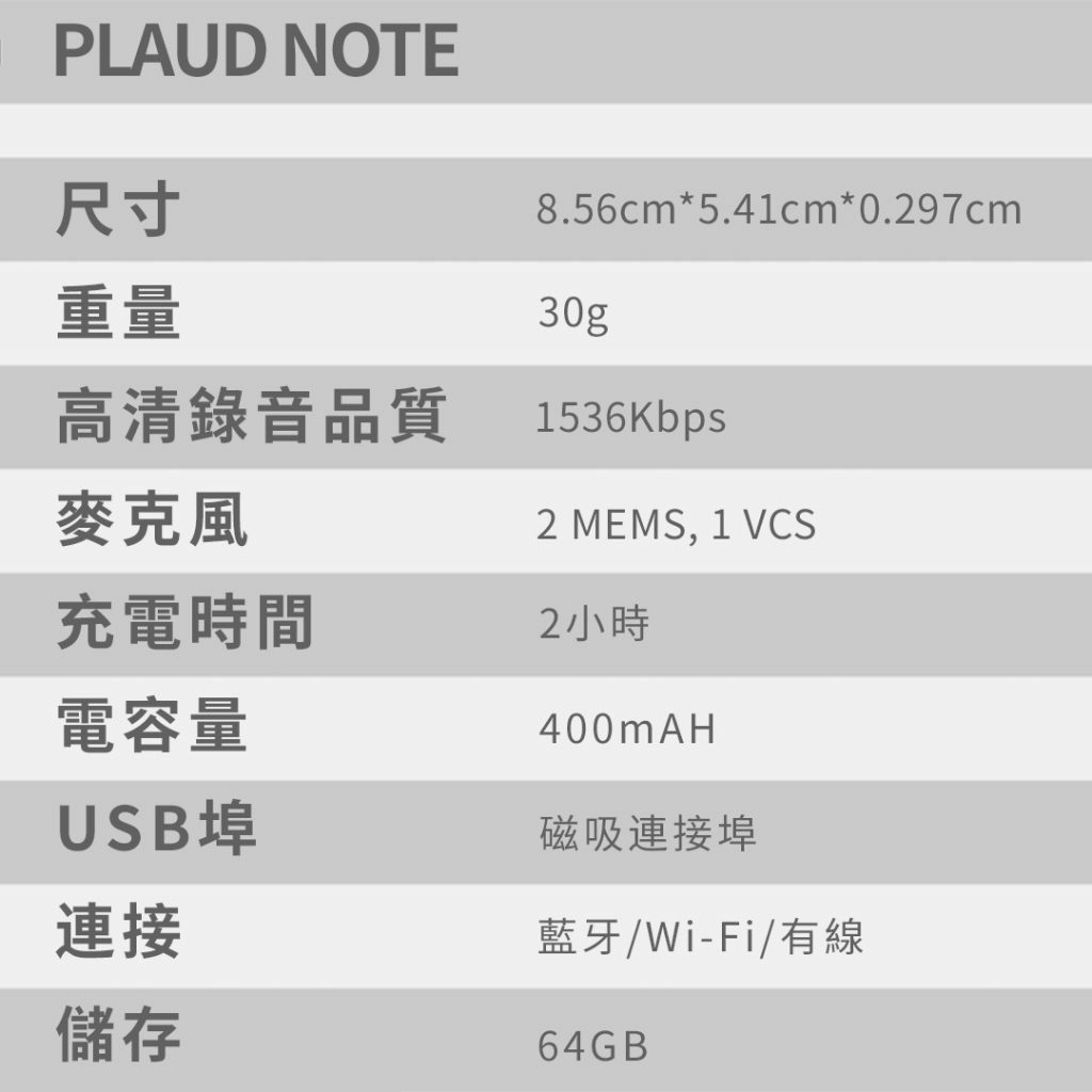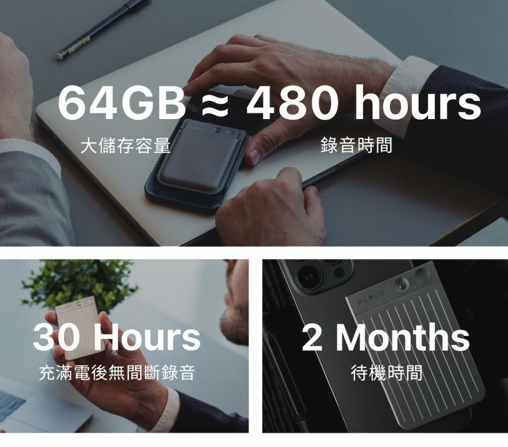 PLAUD NOTE 內建 64 GB 容量,最多可儲存 480 小時的錄音檔,一次充電可以持續錄 30 小時。