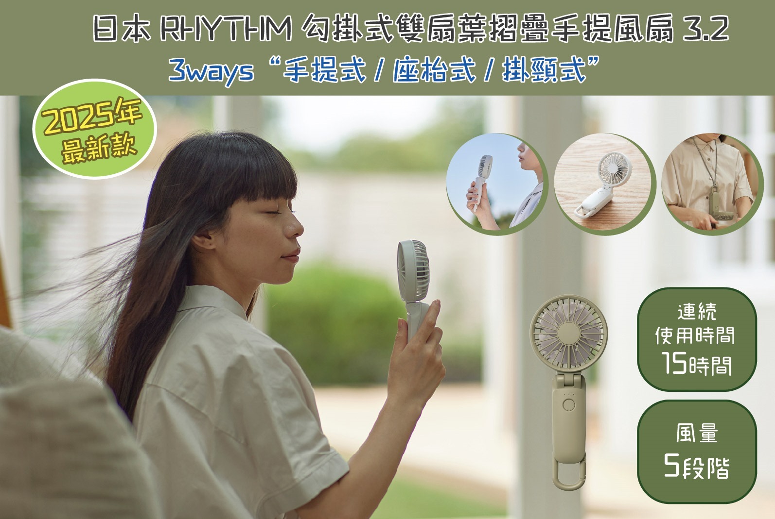 日本風扇名牌 RHYTHM 勾掛式雙扇葉摺疊手提風扇 2025全新型號3.2,