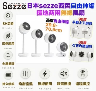 日本 sezze 無線自由伸縮檯地兩用循環風扇丨Type-C充電丨13h持久續航丨室內戶外合用丨 可遙距控制