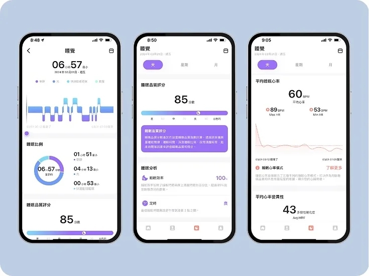 - 管理和追蹤健康狀況: 包括睡眠時間、心律、血氧、步數和燃燒卡路里等